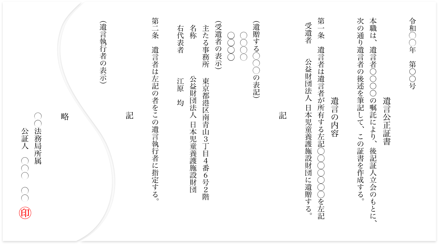 - 遺贈先として「公益財団法人日本児童養護施設財団」を指定された旨をお知らせください。